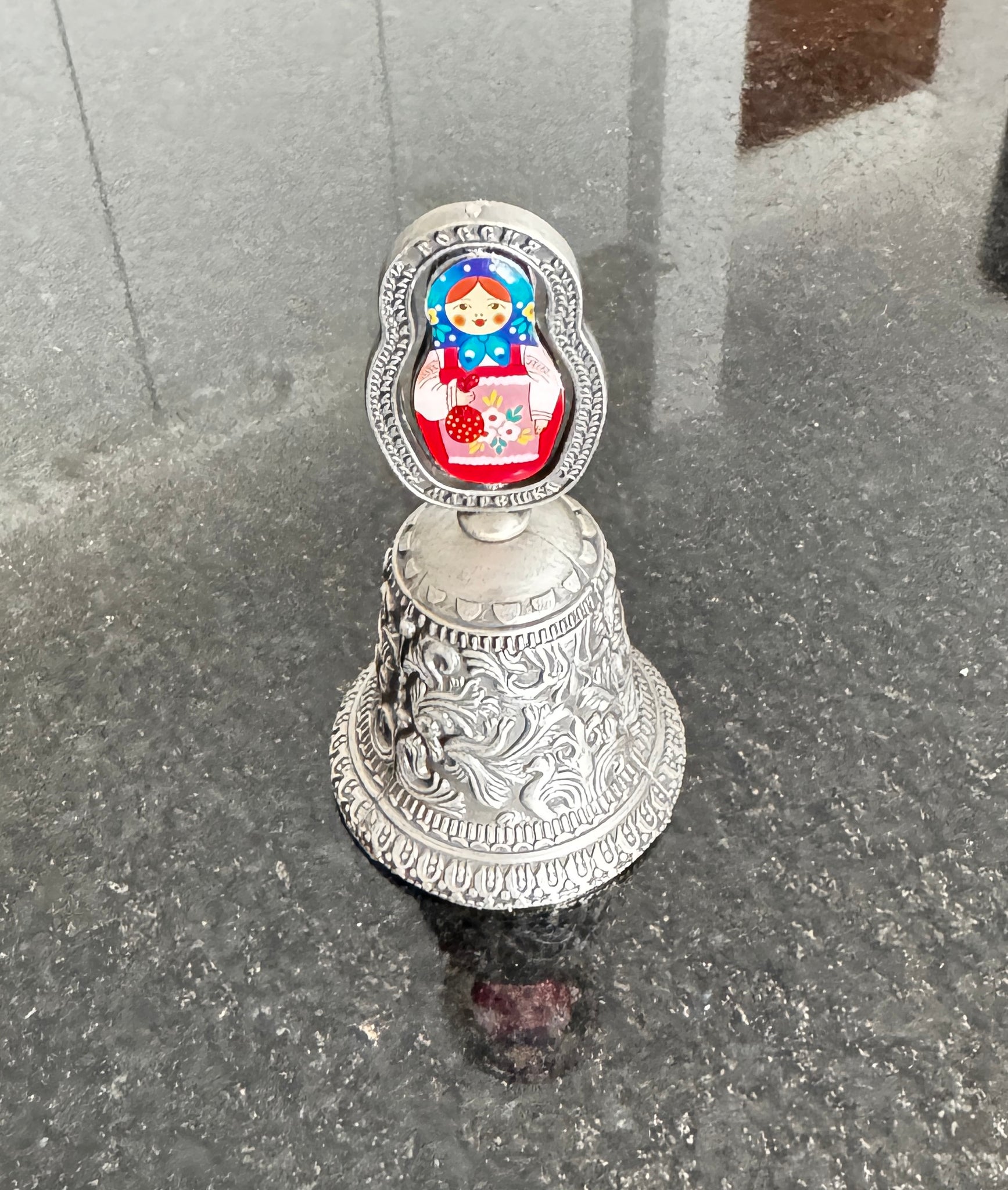 Esta campanilla de metal está realizada en un diseño elegante y refinado. Cada pieza posee una forma única del asa, grabados y ornamentos propios, lo que la convierte en un objeto con carácter y estilo. El acabado plateado, los detalles artísticos y las líneas delicadas hacen de esta campanilla un regalo distinguido y con un toque de lujo.