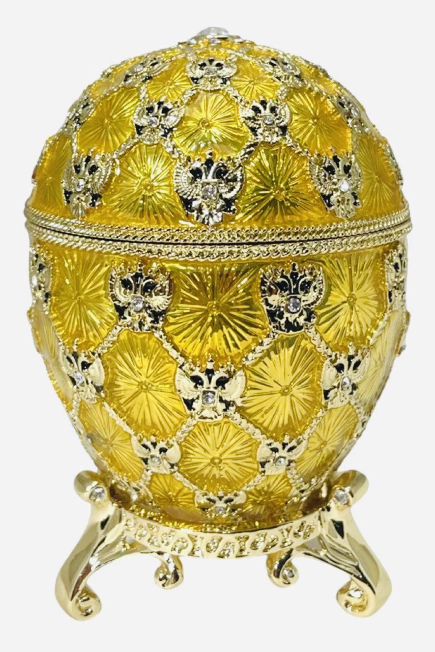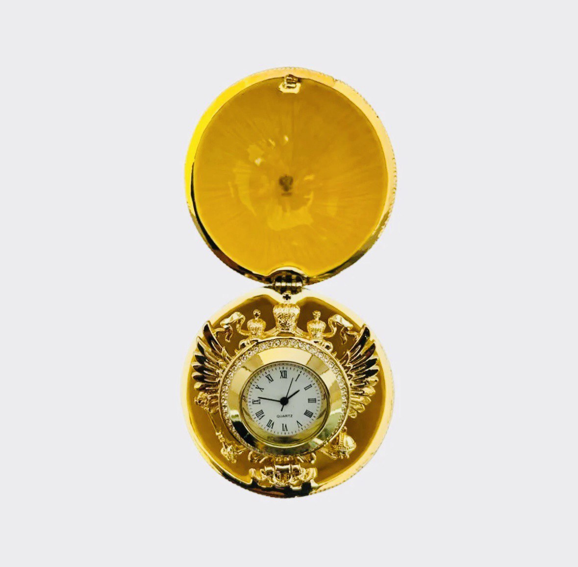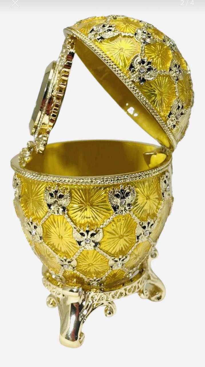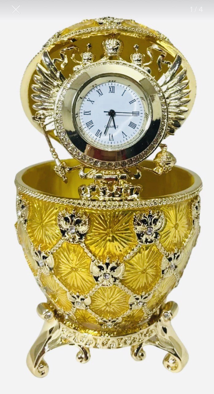 Réplica original de los famosos Huevos de Fabergé de marca AKM certificado, de San Petersburgo, Rusia. Metal con porcelana fina y cristal swarovsky, Este modelo de Reloj Imperial viene con reloj de pila. Excelente regalo en el cual podrán guardar sus joyas preferidas. Estos huevos originalmente los elaboraba el joyero Fabergé para la familia Romanov, los últimos zares de Rusia. Al abrir el huevo colocando a la vista el reloj, mide 12 cm de alto.