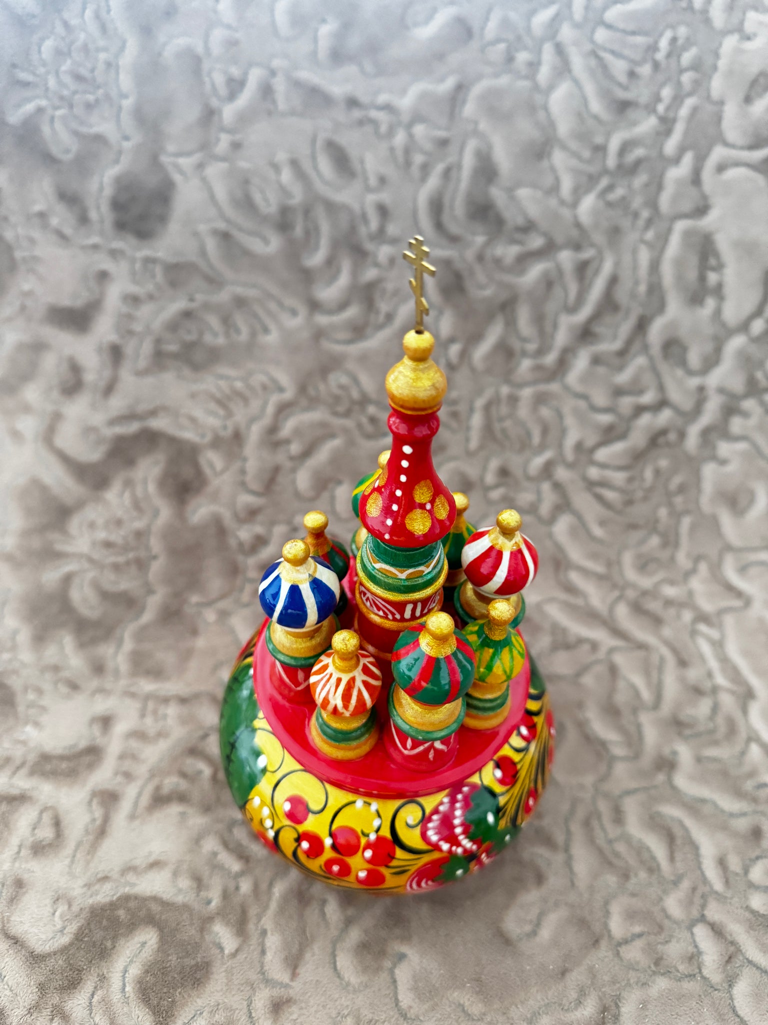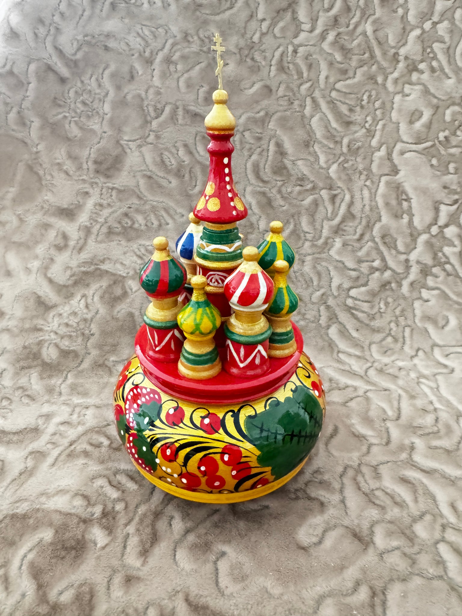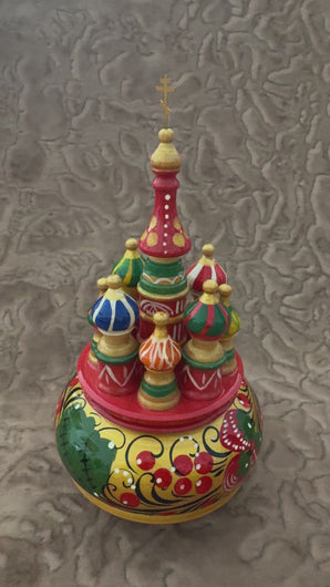 Esta iglesia decorativa es una pieza artística realizada de manera artesanal en madera ecológica. Cada elemento está cuidadosamente esculpido y pintado a mano con motivos tradicionales rusos, lo que convierte cada pieza en única e irrepetible.